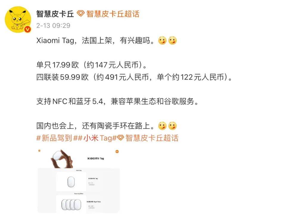 与此同时,博主@智慧皮卡丘的爆料显示,“Xiaomi Tag,法国上架,有兴趣吗。单只17.99欧(约147元人民币)。四联装59.99欧(约491元人民币,单个约122元人民币)。支持NFC和蓝牙5.4,兼容苹果生态和谷歌服务。国内也会上,还有陶瓷手环在路上。”
